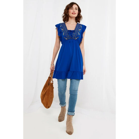 Introducing the epitome of everyday elegance. This V-neck tunic is just what you need to elevate your favourite jeans, tights or leggings. Bringing together beautiful colours and stunning embroidery in a piece that’s loose and easy to wear, it’s perfect for keeping you cool and confident through the summer.