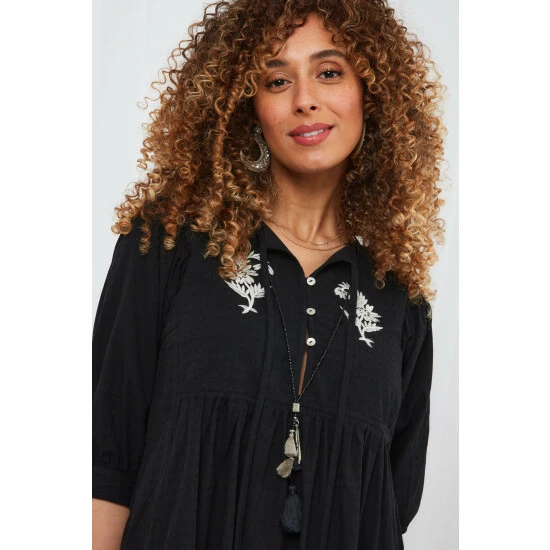 This elegant tunic is all about the embroidery. Simple yet sweet, it’s set off perfectly by the playful neck tie. In a flattering, oversized fit with puff sleeves, it’s perfect for wearing alone or with leggings. Enjoy those hot summer evenings in style with this fabulous tunic.