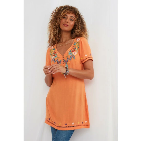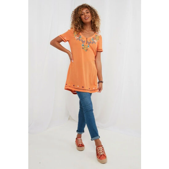 Bring feel-good vibes to your summer style with this exquisite tunic. It’s the combination of seasonal colours and stunning, floral embroidery that’ll help it brighten your day. You’ll look phenomenal wearing this piece with tights and boots, or your favourite leggings and trainers.