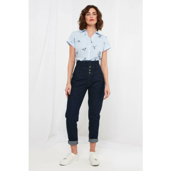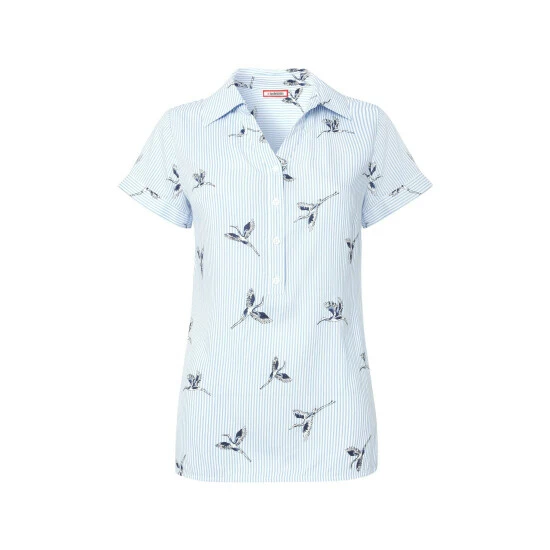 Need for a playful look for those laid-back summer days? This blouse has you covered. The relaxed fit makes it great for warmer weather, while the soft collar and crane print add that fabulous, fun touch. Just pair it with shorts or a skirt to really bring those seasonal vibes.