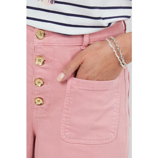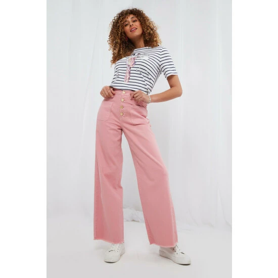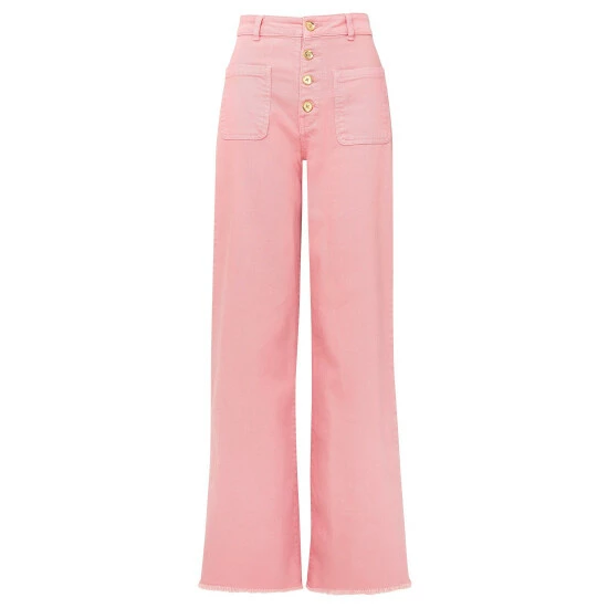 These jeans will transform any outfit into a chic look. Just choose pink or white and watch the unique gold buttons add that subtle touch of sophistication. You’ll love how they fit too, since the high waist and wide legs will flatter any figure. How will you style yours?