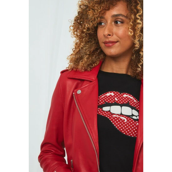 Now in a rich, red colour, our best-selling leather jacket is back and better than ever. We just can’t get enough of the stud detailing – the zipped cuffs and epaulettes on the shoulders really add to its sleek look too. Pretty with a sharp edge, it’s the perfect piece to give your outfits an attitude boost.