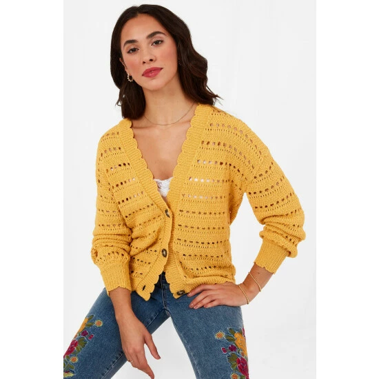 Bring a splash of summer to your wardrobe with this knitted cardigan. It’s the gorgeous shade of yellow that makes it such a standout style. Look a little closer, and you’ll love how the colour works with the scalloped edges and wooden buttons to create such a delicate design. Just add jeans or dungarees for a charming everyday outfit.